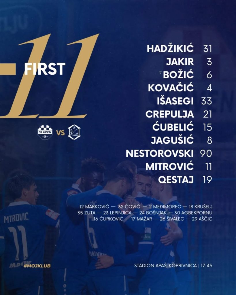 Slaven (4-2-3-1): Hadžikić – Išasegi (Lepinjica 46’), Božić, Kovačić, Jakir – Ćubelić (Zuta 75’), Crepulja (Agbekpornu 6’) – Questaj (Aščić 58’), Jagušić, Mitrović – Nestorovski. Trener: Mario Gregurina