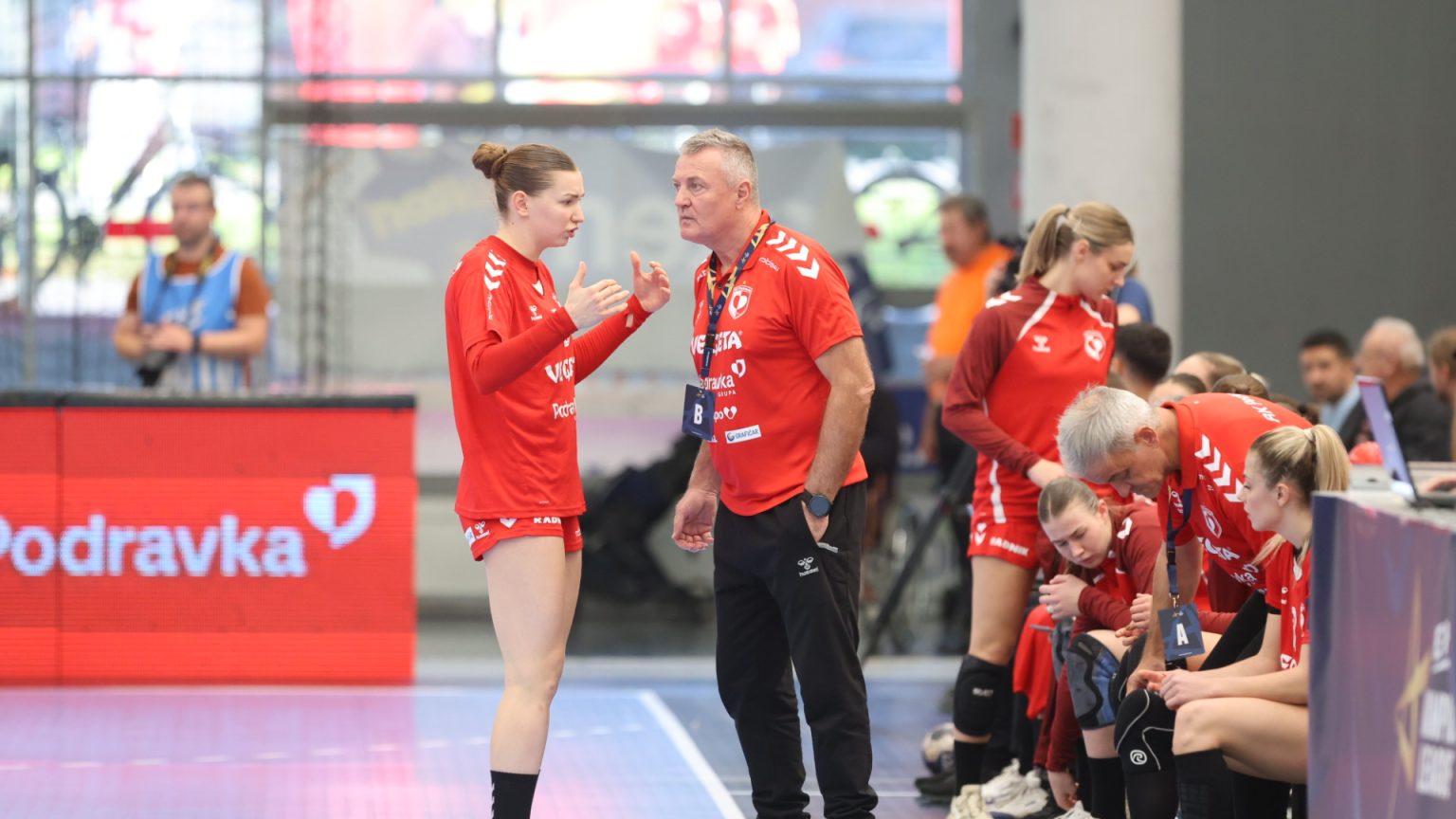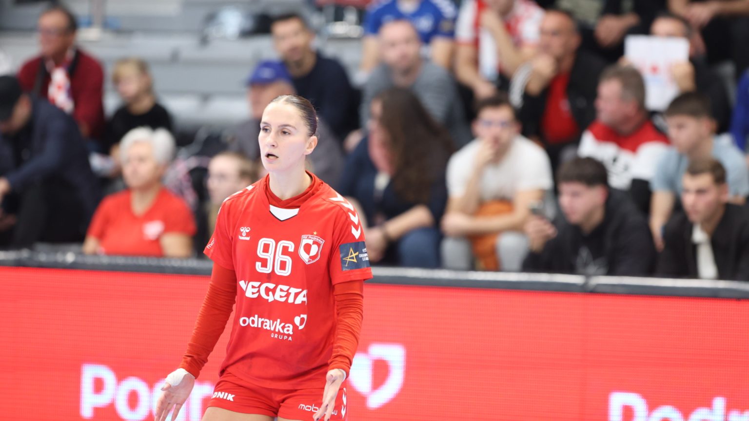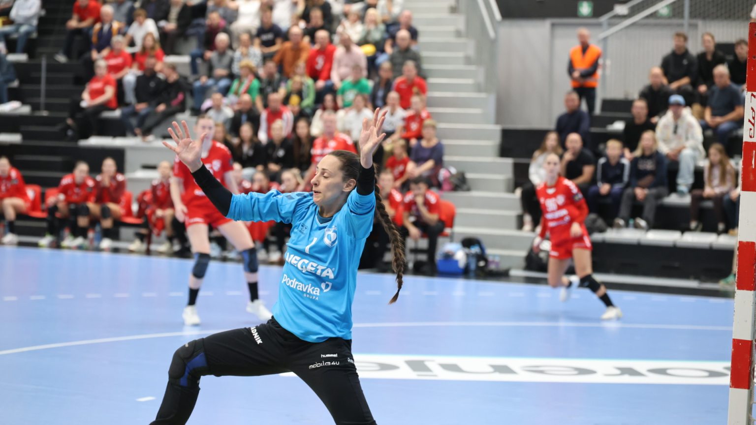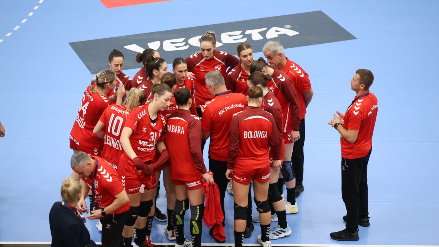 Podravka je na poluvremenu zaostajala s tri gola razlike (16:19), a nastavak je donio još više pogodaka i napetu završnicu, no domaće djevojke se nisu uspjele približiti dovoljno da bi preokret bio moguć. Najefikasnija igračica u redovima Podravke bila je Katarina Panđa s čak osam pogodaka, slijedile su je Matea Pletikosić sa sedam i Josipa Mamić sa šest. Ana Debelić postigla je četiri, Andrea Šimara tri, Tina Barišić i Ana Pandža po dva, dok se jednom u strijelce upisala Katja Vuković. Vratarka Lucija Bešen bila je na 14% obrana.