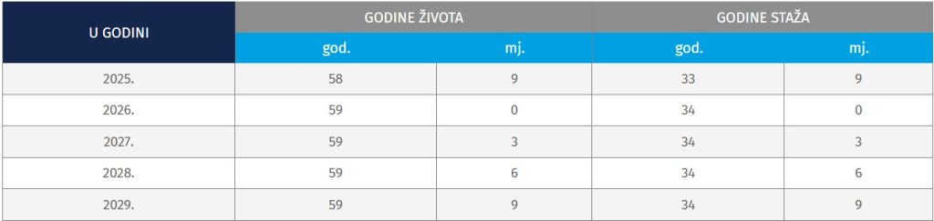 Pravo na prijevremenu starosnu mirovinu stječe osiguranik kada navrši 60 godina života i 35 godina mirovinskog staža. U prijelaznom razdoblju od 2020. do 2029. godine žene ostvaruju pravo na prijevremenu starosnu mirovinu prema povoljnijim uvjetima, s nižom starosnom dobi i kraćim mirovinskim stažem.