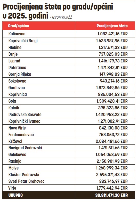 I dok je, kao što je navedeno, šteta samo u Koprivničkoj županiji iznosila više od 30 milijuna eura, Vlada je 17. prosinca prošle godine donijela Odluku o dodijeli sredstava za pomoć, ublažavanje i uklanjanje posljedica prirodnih nepogoda. Ali u ukupnom iznosu od 1,36 milijuna eura za cijelu Hrvatsku, od čega je jedinicama lokalne samouprave u Koprivničko–križevačkoj županiji, barem za sada, pripalo – ništa!
