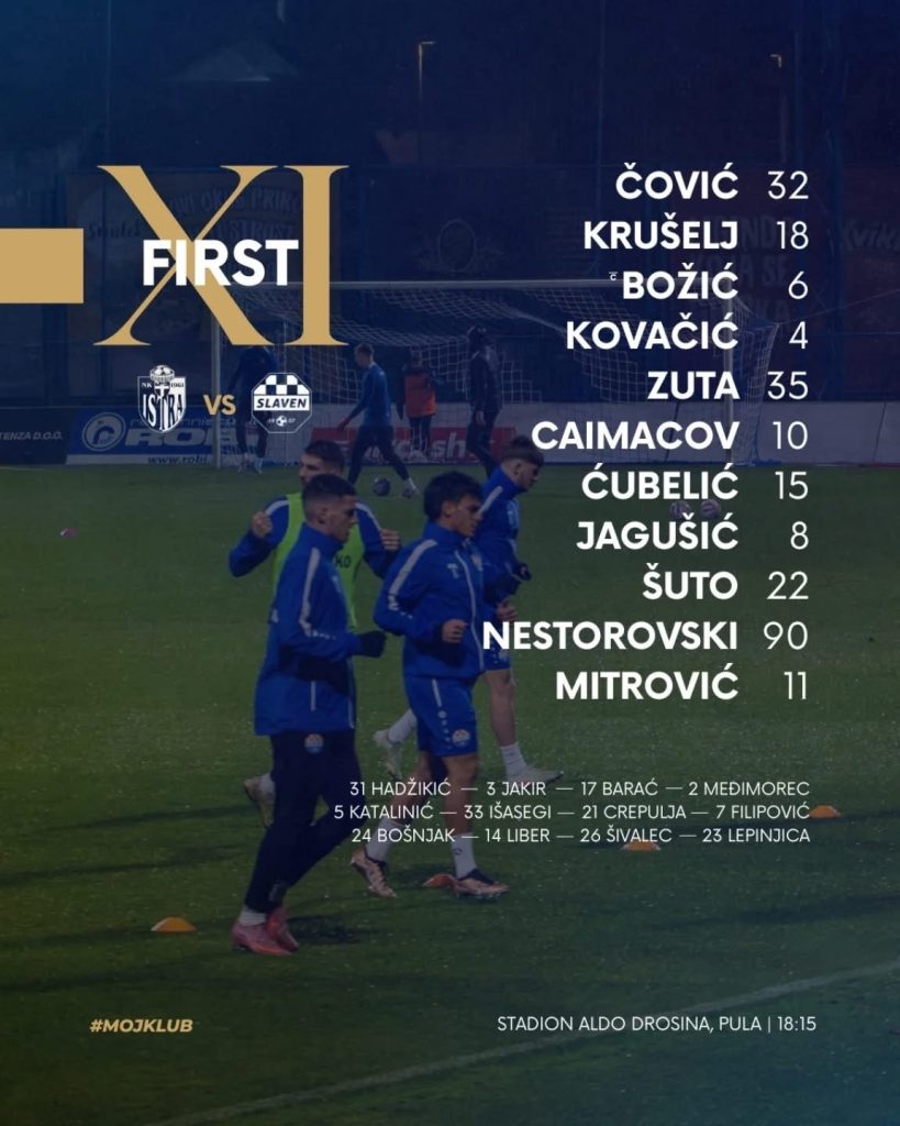 Istra 1961 (4-3-3): Kolić – Jay (Prevljak 70’), Kumar, Koski, Robertson (Heister 77’) – Ayuma (Djuric 61’), Radošević, Maurić – Lončar (Bangura 77’), Lawal, Frederiksen, Trener: Oriol Riera