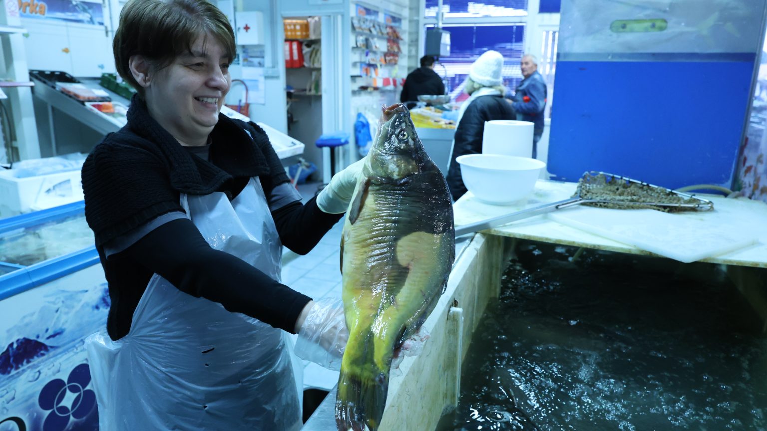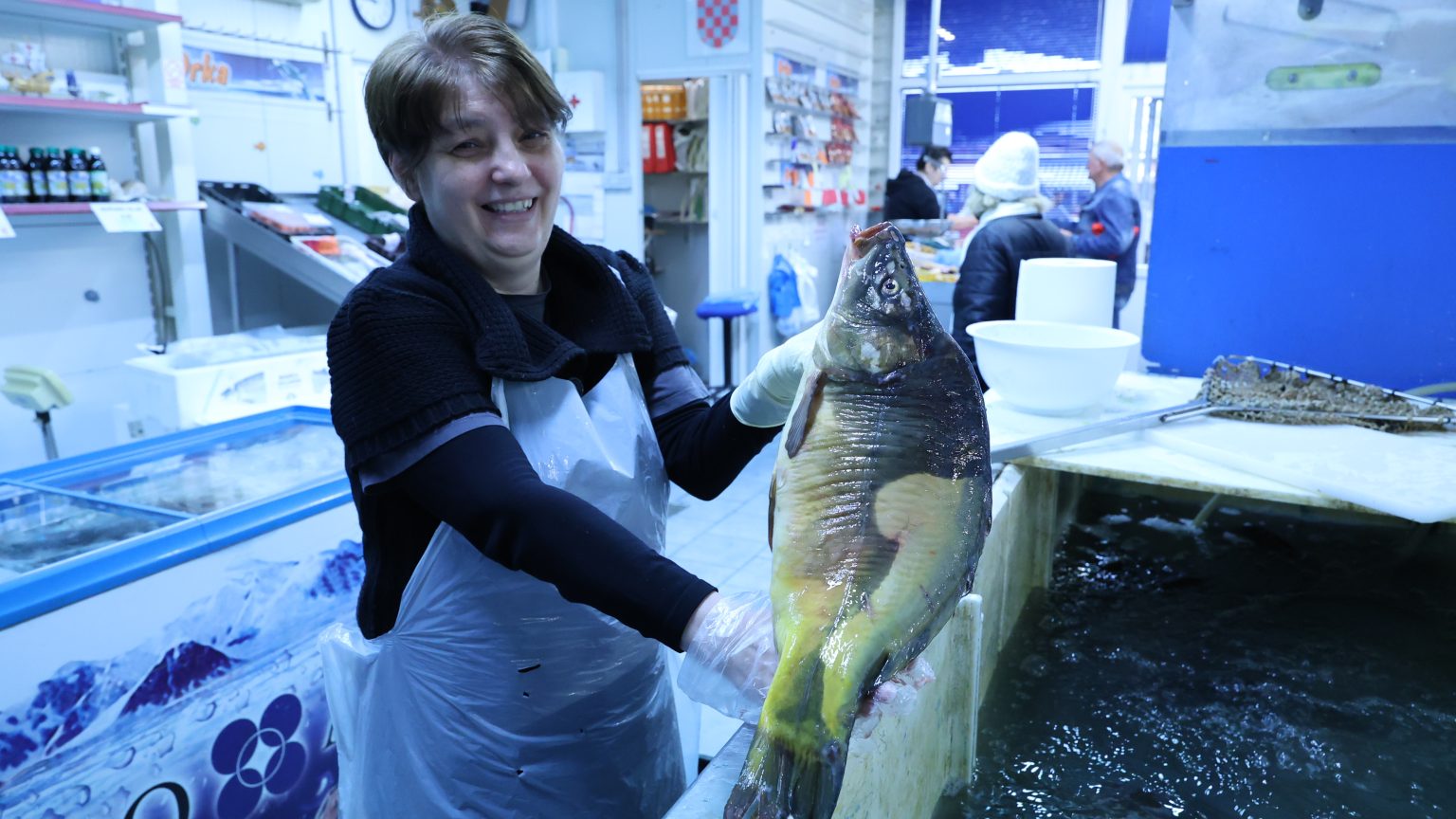Bliži se Veliki petak pa je tako i u ribarnici na koprivničkoj tržnici živo od jutra, no prava gužva tek se očekuje. Ima svega – i riječne i morske ribe, ali i robe po narudžbi. Rekla nam je tako Nataša i dodala da se najviše traži šaran.